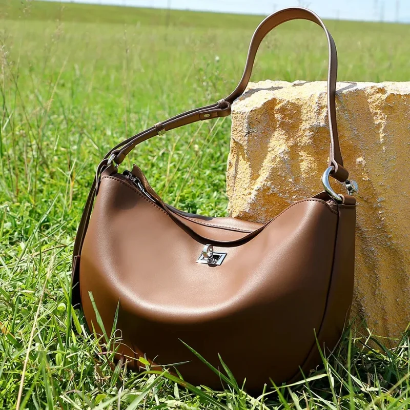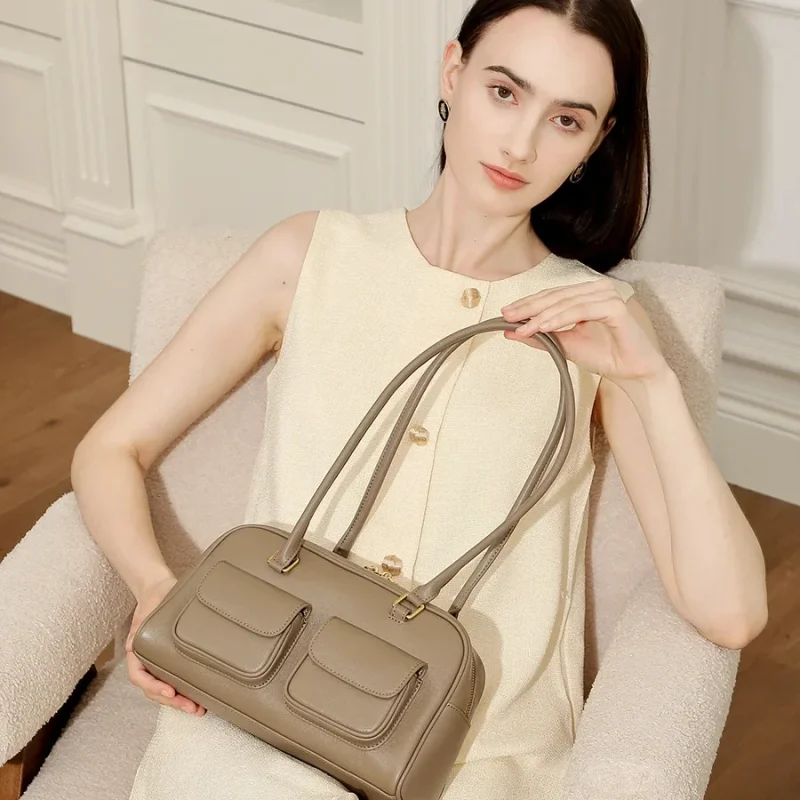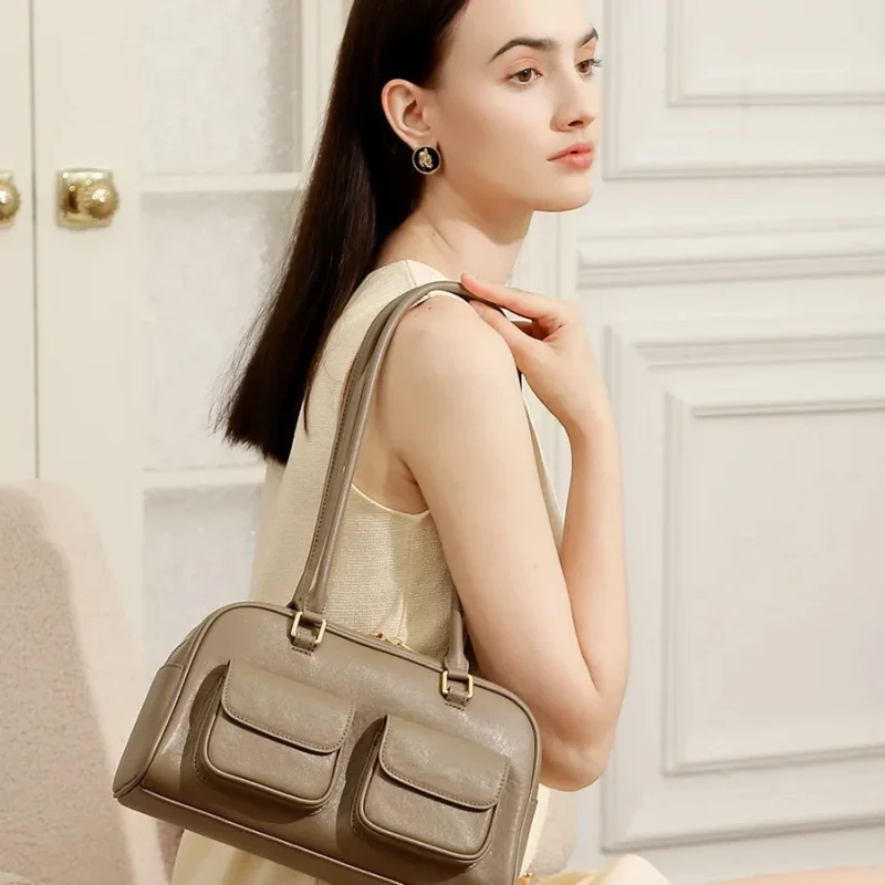 復古女士真皮革手提包保齡球包拉鏈閉合聚酯腋下肩背包 HK$112.00